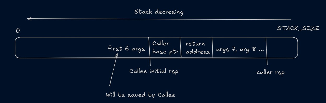 Switching between functions is not so complicated. When the signal is handled, the kernel provides us a pointer to all the registers and we can copy them, and we can also change them. What is complicated is to start a function as an async function. We need to store the value of registers right after the function prologue, and we need to store the value of the args(>7) that are stored on stack. I have used inline assembly to store the register values, and I store the rbp register value (rbp_caller) right before the caller calls the callee and right after the callee function's prologue (rbp_callee). The space between these two addresses is where the return address, base pointer and arguments (>7) are stored.