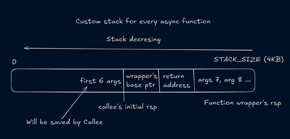 For every async function, an 8KB(can be changed during compilation) memory space is allocated as its own custom stack, and the data between rbp_caller and rbp_callee is copied. The initial idea was that we can embed some assembly code at the starting of the function to save the state of the registers and the stack and then we'll stop the execution of the function after storing its state by calling the leave and ret instruction. And then put a label (1:) just after these instruction. And We can store the rip register (address of the next instruction) at the address of the label 1. When any function calls the an async function, we store the context and then return without executing any of the code. And when the executor will put this function in its own context, it will skip the register and stack copying logic and jump to the label 1, and start executing the body of the function. That did not worked.